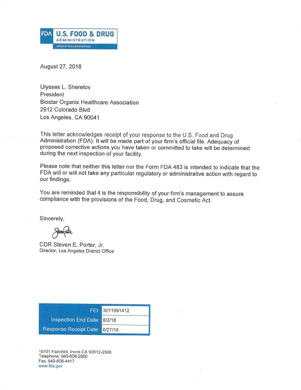 Biostar Organix Healthcare Association sent us a copy of the letter from the FDA dated 08/27/18 (below), which now is correctly addressed to Biostar Organix Healthcare Association, and no longer Biostar Technology International, LLC.